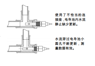 為確保電導(dǎo)池測量結(jié)果準(zhǔn)確,應(yīng)避免電導(dǎo)池間因有氣泡或死水而造成數(shù)據(jù)失準(zhǔn),請(qǐng)嚴(yán)格按下圖正確安裝方式安裝: