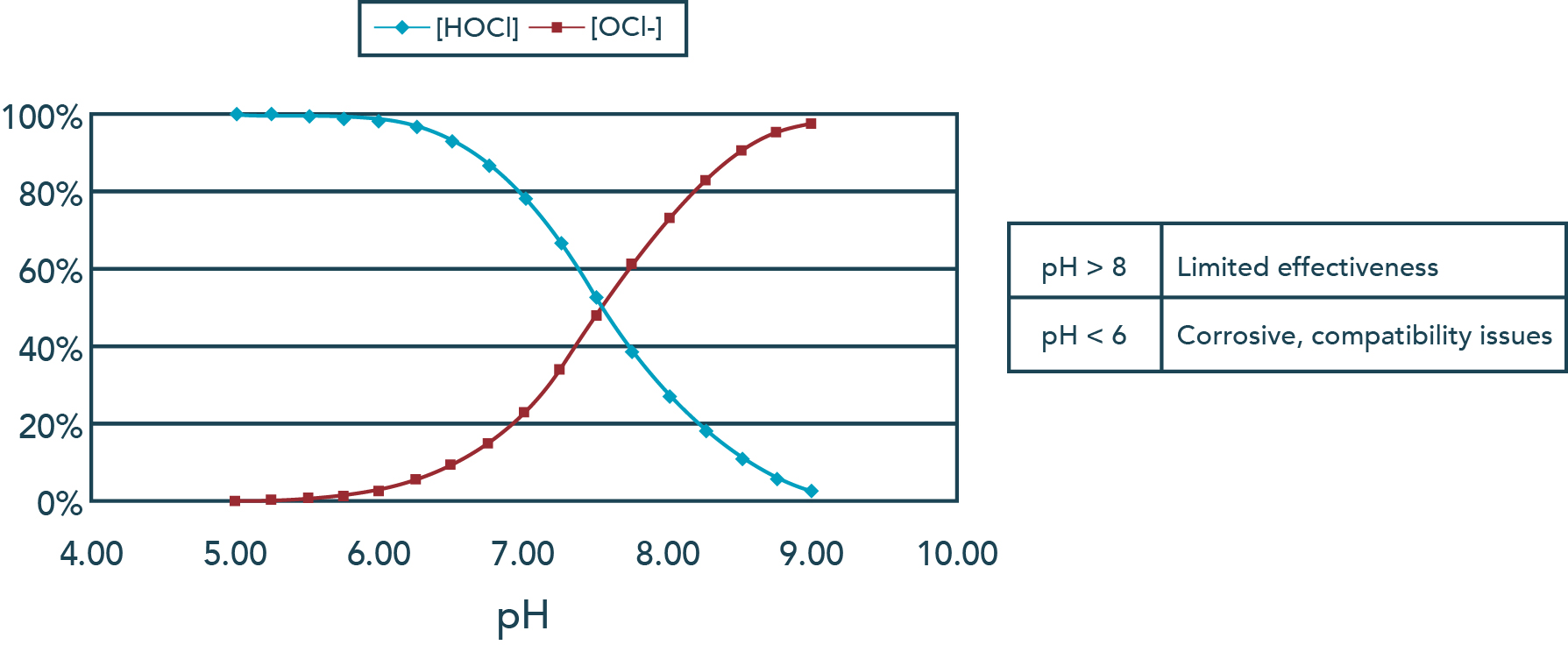 氯可以作為游離氯或氯胺存在。兩組都可以氧化化合物并實現(xiàn)治療目標(biāo),但是,需要更多的氯胺來滿足相同的氯需求。游離氯測量分別考慮水中的離子形式和質(zhì)子化形式的氯,OCl-和HOCl。在這兩者中,HOCl(次氯酸)是更強的氧化劑,并且在7.5的pH下是主要的。